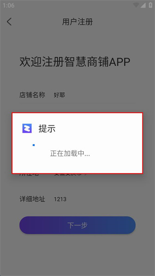4、提交后等待页面加载,完成智慧商铺APP的用户注册流程。