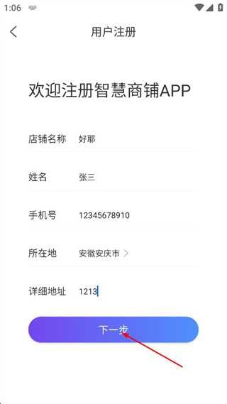2、在用户注册页面输入店铺名称、姓名、手机号、选择所在地并输入详细地址。