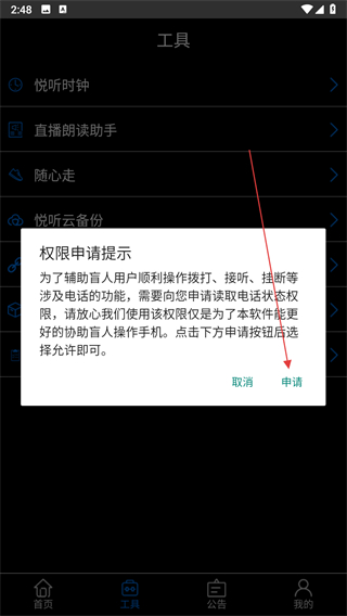 3、弹出权限申请提示,点击申请并允许读取电话状态权限。