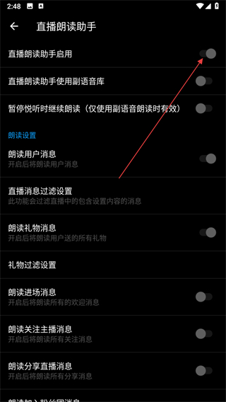 4、找到直播朗读助手启用选项,点击开关按钮将其开启。