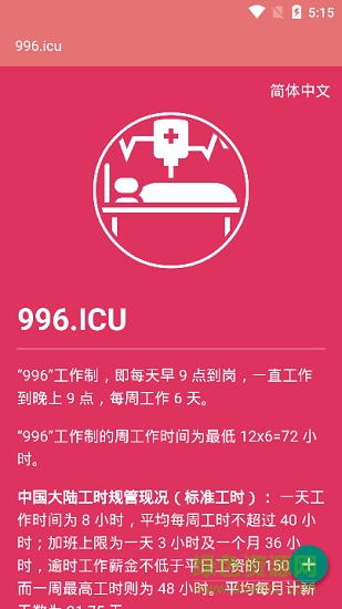 所谓“996”,是指员工从每天上午9点工作到晚上9点,每周工作6天;“ICU”则指,经受了长时间工作的折磨后,员工可能罹患各种重大疾病,到时候直接送去ICU病房就可以了。