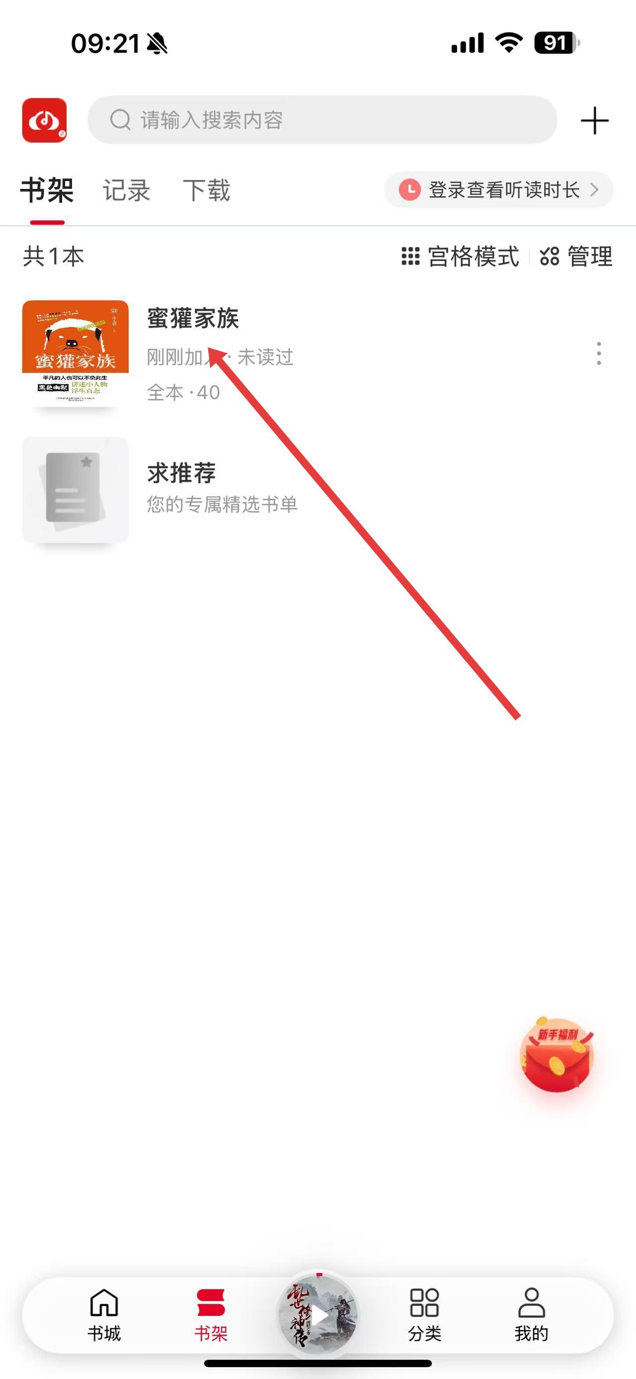2、在书架页面中,点击想要阅读的书籍,比如蜜獾家族。