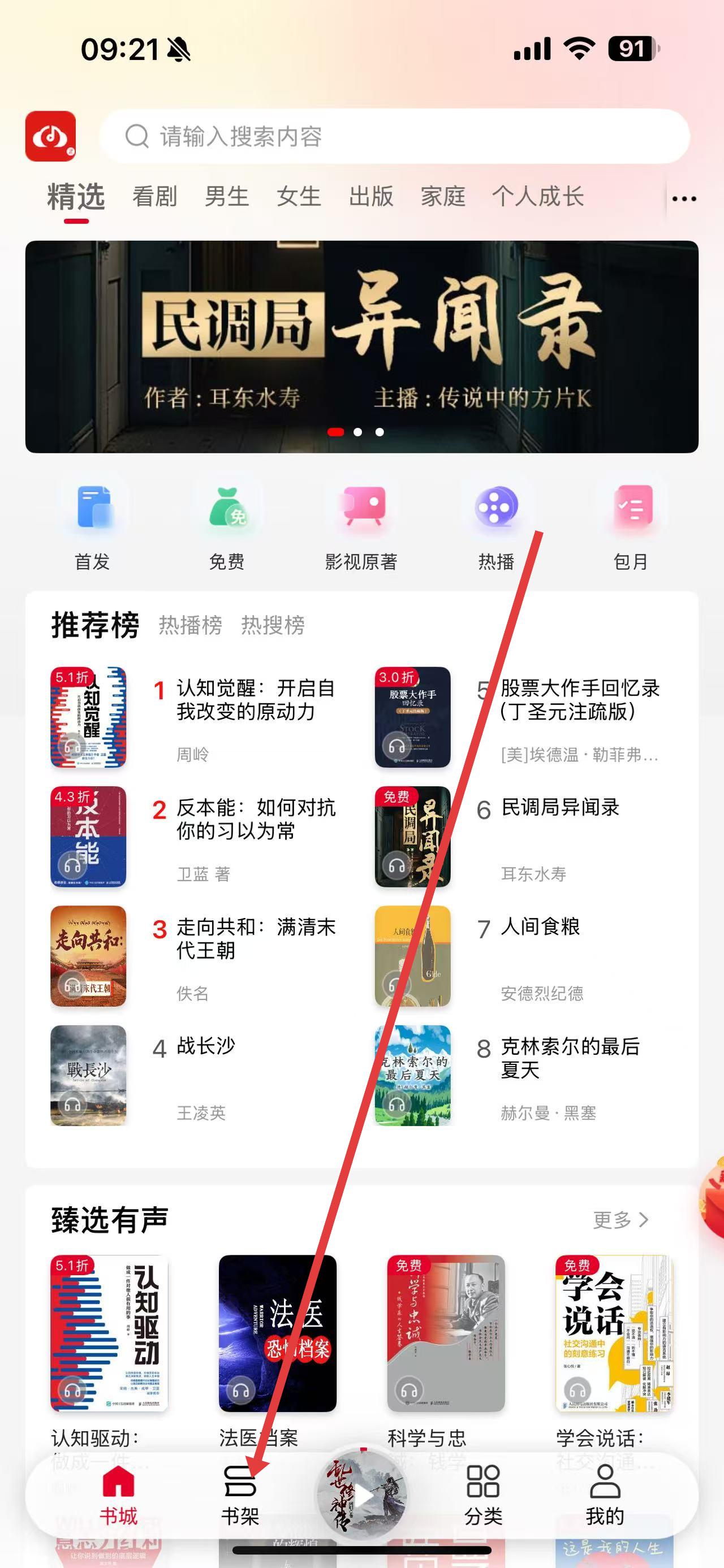 1、打开联通爱听APP,点击底部导航栏中的书架选项进入书架页面。