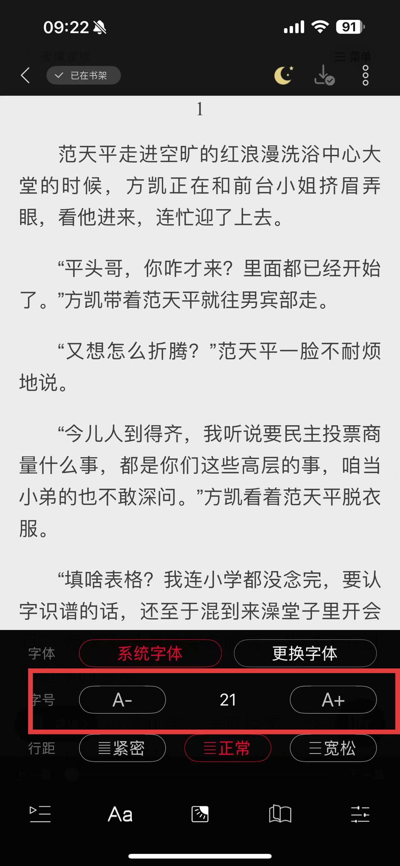 4、在弹出的设置界面里,通过点击A-或A+来调整字体大小。