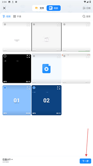 2、勾选需要合并的多个视频文件,选好后点击下一步进入编辑页面。