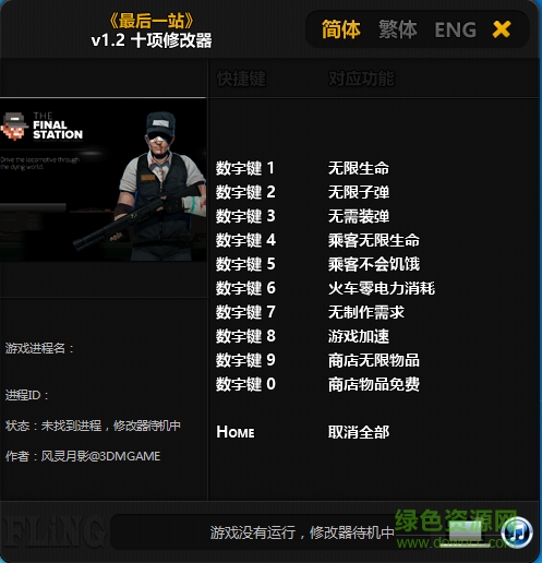 最后一站修改器是专为同名pc游戏提供的一款免费辅助工具,通过该辅助玩家可以自由修改游戏中的各项属性,其中包括无限生命、无限子弹、无限装弹等,并且支持简体、繁体、英语三种语言,需要的朋友欢迎来绿色资源网下载!