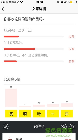 4.在文章详情页,你可以通过观点投票、心情投票和留言评论等方式参与文章的互动,留下你对产品或者事件的态度和观点,也可以提出你对设计癖的看法与建议。