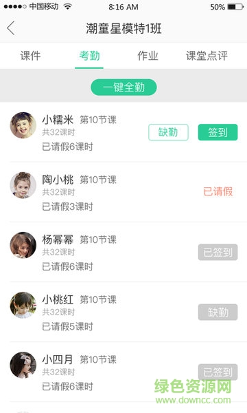 【考勤】对学生进行考勤管理,显示学生请假、到勤记录,并将考勤记录及时发送到家长端。