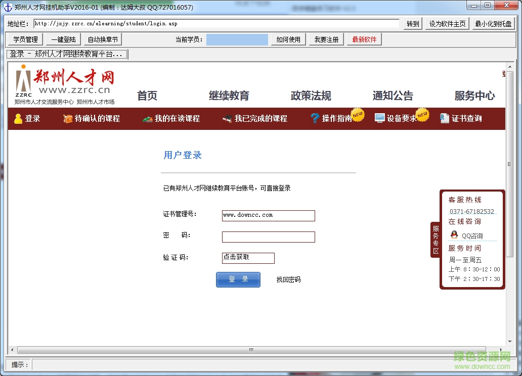 软件介绍 软件标签: 挂机助手 郑州人才网挂机助手是一款为郑州人士在线学习继续教育和政策法规的挂机工具,帮助你快速的学习完网上的所有课程,节省时间和精力,快来绿色资源网下载吧!官方介绍郑州人才网挂机助手,使用本软件可在郑州人才网远程学习时自动换课程章节学习。若使用IE浏览器在郑州人才网正常学习时课程章节繁多要常手工换章节且中间会出现要回答问题。若使用本挂机软件远程学习则软件会自动换课程学习直至你选的课程章节全学习完。此软件只是为了让你学习时省去手工操作的烦恼,让你可认真学习里面的内容,请正确对待。使用说明1.下载并解压文件2.运行exe程序3.输入证书编号和密码并进行验证4.选择课程开始学习 软件截图 上一张下一张(1 / 1) 安装详细截图 猜你喜欢 继续教育 继续教育 继续教育app哪个好用?在此为大家提供了保险行业以及驾驶行业和会计行业,和医学继续教育以及教师行业等众多行业中的继续教育学习软件,同时支持在线成绩查分服务,让你能够从学习的阶段到考试阶段都能够获得不错的帮助,轻松的掌握各类知识,实现轻松考证,获得资格证的效果,为你提供不错的操作体验! 查看更多>> 东奥华宇继教客户端 4.13M/中文/5.0/v2.0.0 安卓版下载 2019执业药师继续教育 9.20M/中文/5.0/v2.4.1 安卓版下载 中科院继续教育网app 42.74M/中文/7.5/v2.2.0 安卓版下载 宜昌卫生信息网v2系统 669KB/中文/5.0/pc登陆版下载 安安继续教育 9.21M/中文/5.0/v1.0.0 安卓版下载 济宁人社通继续教育电脑版 0KB/中文/4.0/v2.2.2 pc最新版下载 其他版本下载 标题 大小 更新日期 下载 下载地址 电脑版 郑州人才网继续教育挂机助手 v201601 绿色最新版 点击报错 软件无法下载或下载后无法使用,请点击报错,谢谢! 关闭报错反馈 请描述您所遇到的错误,我们将尽快予以修正,谢谢! *必填项,请输入内容 本类最新 offergoose多面鹅 v1.0.28.2 最新版 多面鹅面试工具 v1.0.28.2 最新版 课海网电脑版 v2.2.3.2 官方版 人人通教育平台电脑版 v1.0.3 官方版 师训宝管理端最新版pc v5.0.7 官方版 一起小学学生pc版 v2.6.4 官方最新版本 相关文章 Win2003 sp2下安装IIS,会提示找不到iisadmin.mfl等文件无法继续安装的解决方法 Windows7与windows xp应该继续使用XP的理由 用户评论 热门评论 最新评论 发表评论 查看所有评论(0) 昵称: 请不要评论无意义或脏话,我们所有评论会有人工审核. 字数: 0/500 (您的评论需要经过审核才能显示)