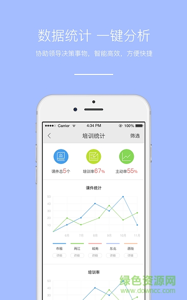 统计分析:为领导和学员提供一整套的数据统计分析,领导可以随时查看所有学员的相关学习情况;学员也可以查看和统计自己的数据信息。