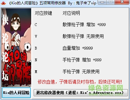 Kio的人间冒险修改器是专为同名pc游戏提供的一款免费辅助工具,通过该辅助玩家可以自由修改游戏中的五项属性,其中包括血量增加+999、手枪子弹无线使用等,合理的修改游戏属性能够让玩家更加愉快的体验游戏,需要的朋友欢迎来绿色资源网下载!