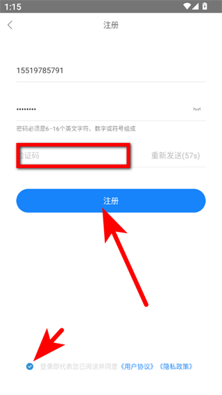 3、在验证码输入框中输入验证码,勾选同意用户协议和隐私政策后,点击注册按钮。