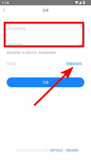 2、在注册页面,输入手机号或邮箱、密码后,点击获取验证码。
