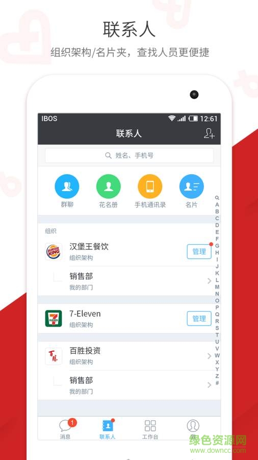 联系人:企业通讯录,快速查找部门同事;名片夹/花名册,轻松拓展、积累人脉,带来更多的商业合作机会。