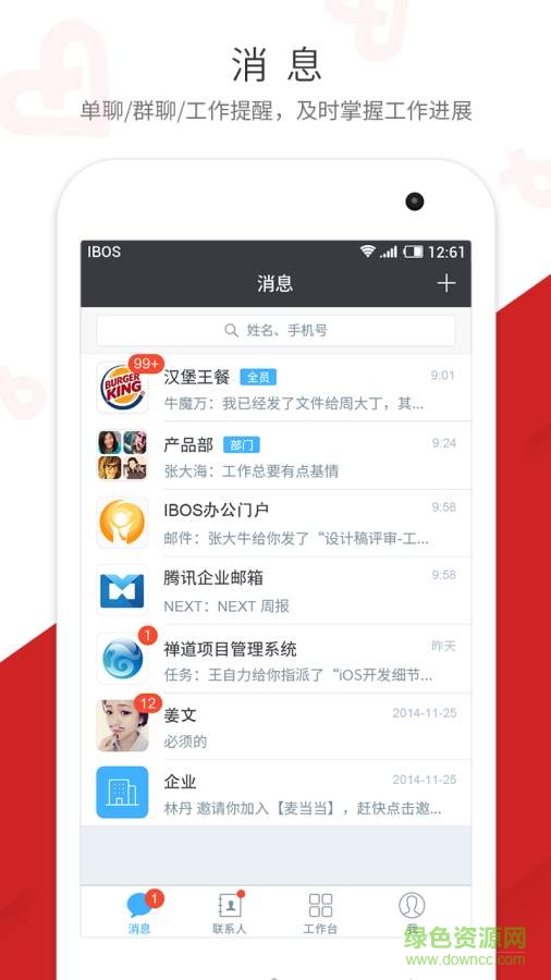 消息:单聊/群聊,随时随地与他人进行交流,提高工作沟通效率;工作提醒,让你随时随地掌握工作进度。