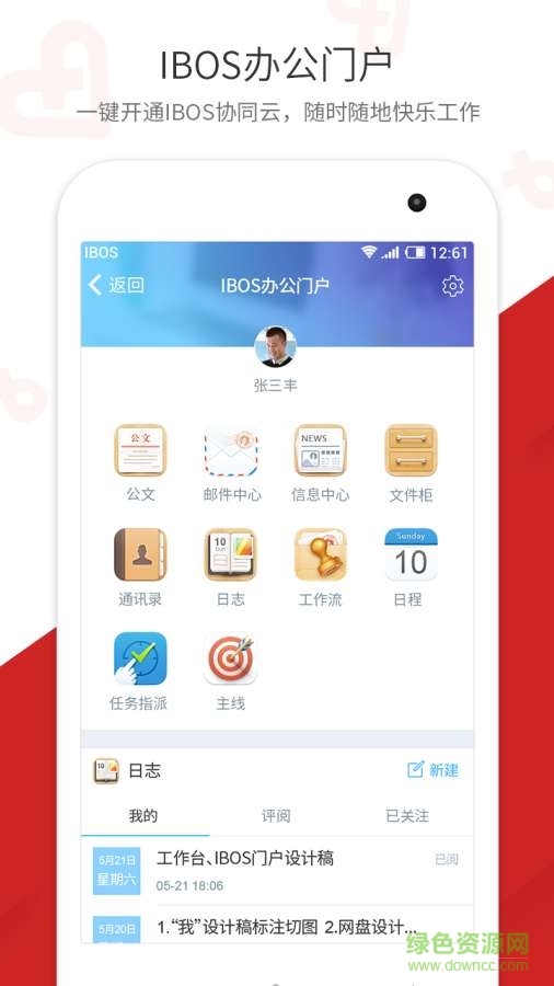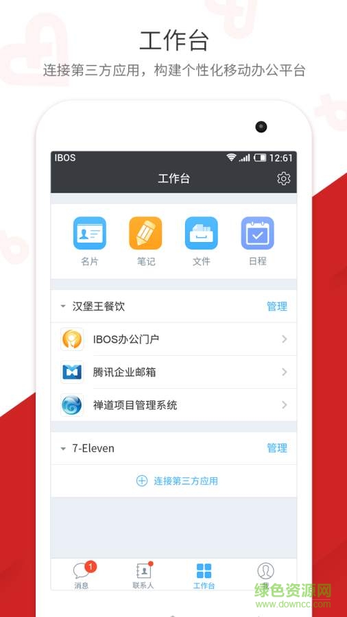 工作台:名片、笔记、文件、日程四大基础应用,可以大幅提高你的日常办公效率;连接第三方应用,一键开通IBOS办公门户,构建你的个性化移动办公平台。
