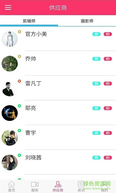 美拍拍app是一款视频拍摄服务平台应用,用户可通过该平台搜索专业的摄影师和剪辑师,专人为你打造个性化视频,同时还提供各种摄影活动资讯!有需要的朋友欢迎在绿色资源网下载!