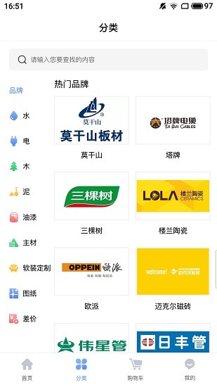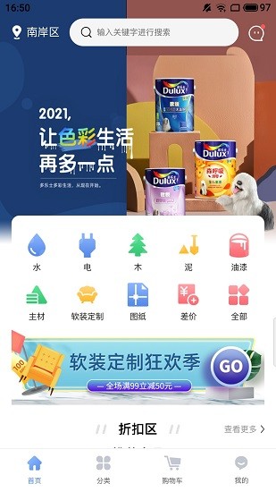 材易购软件是非常好用的一款装修类手机购物app,平台上有非常丰富的家装类商品进行选择购买,水、店、木、泥、油漆、主材、软装定制、图纸、差价等等等等全都能够找到,所有的商品全都是一线品牌,让用户们能够更好的找到自己需要的。