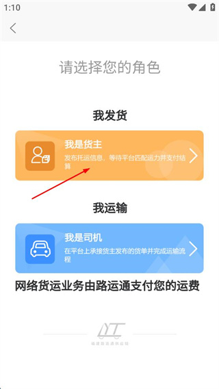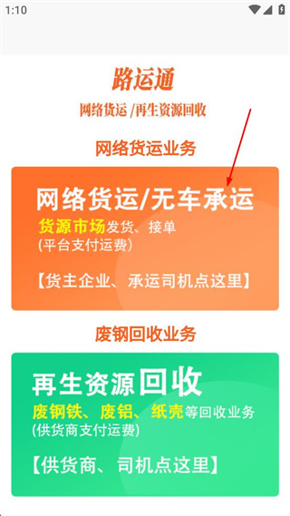 1、打开路运通应用,进入业务选择页面后,点击网络货运/无车承运对应的区域,进入角色选择页面。