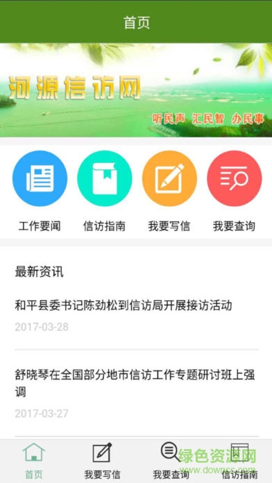 河源信访是一款专为河源市民打造的手机信访app,最新政府动态资讯时刻掌握知晓,掌上信访全民参与不良行为在线举报共建和谐社会。快来绿色资源网下载体验吧!