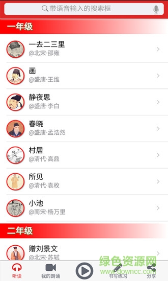 小学诗词朗诵包含了小学生必背的古诗词(含拼音),共104首,含有“语音朗诵”、“视频录制”、“诗词练习”等功能。