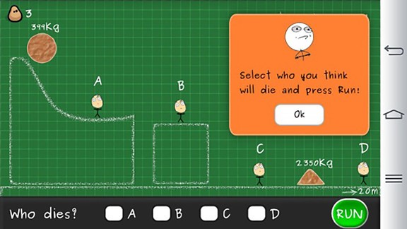 谁会挂呢是一款把学渣们虐出翔的小游戏,巨石落下,到底有几个人会被砸死呢,这就需要你来计算了,巨石重量,障碍物重量,速度,加速度都会在屏幕上显示出来,你真的算算,表瞎蒙!