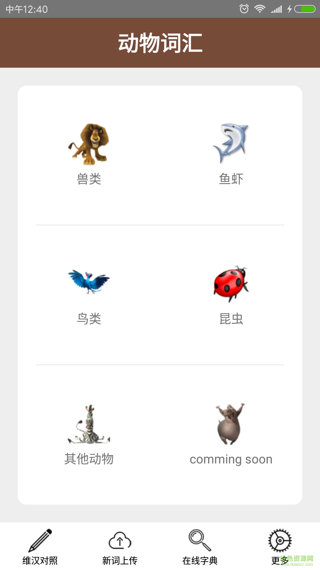 动物词汇app是帮助语言初学者认识动物的软件,不仅有动物名词解释,还有与之相符的图片。让用户在视觉与听觉上双重领会。帮助您认识更多的动物。
