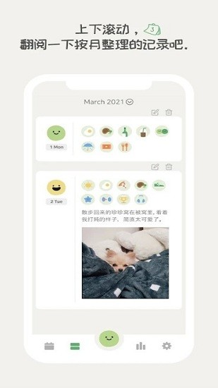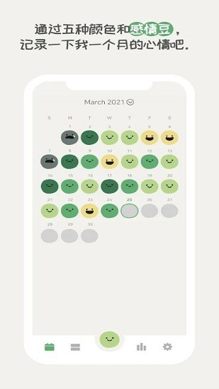 通过五种颜色和表情豆,确认一下我一个月的心情吧。点击豆豆后,可以立即确认当天所记录的内容。