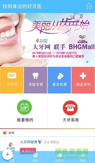 大牙,专业口腔诊所搜索,牙医预约平台.数千名牙科专家,上万家口腔诊所尽收掌中!在线咨询,免费预约,患者点评,更方便,更靠谱!免费洗牙、拔牙、烤瓷牙、美白牙会员特权,惊喜不断!马上下载大牙app,随时随地,找到身边好牙医!
