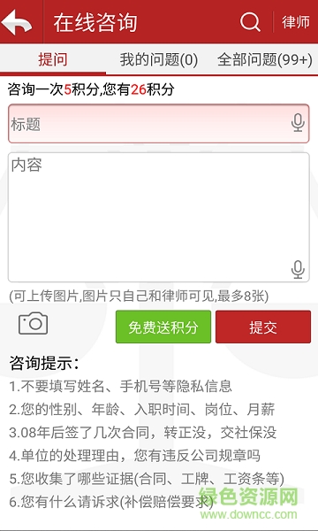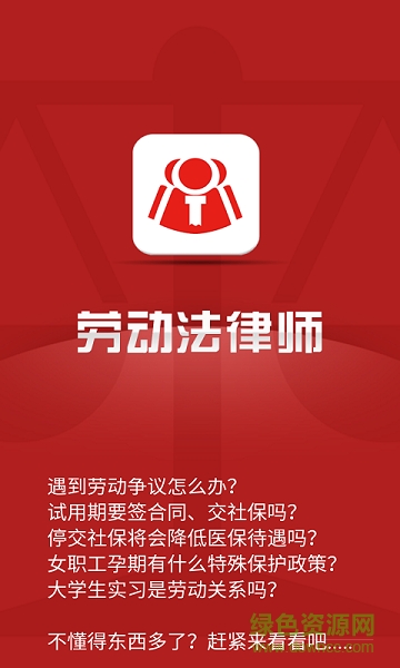 劳动法律师app是一款律师服务类应用,用户可以像律师进行在线咨询服务,这里拥有上百名专业劳动律师为你在线免费提供咨询服务,解决各种劳动争议问题,维护百姓的相关权益,想获取更多服务和相关内容,欢迎前来绿色资源网下载!