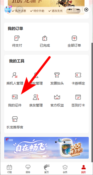 1、打开长龙航空APP,点击底部导航栏的我的选项,进入个人页面。
