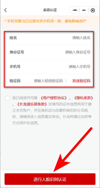 4、在实名认证页面,填写姓名、身份证号、手机号和验证码,勾选同意相关协议后,点击进行人脸识别认证按钮,按提示完成人脸识别即可完成实名认证。
