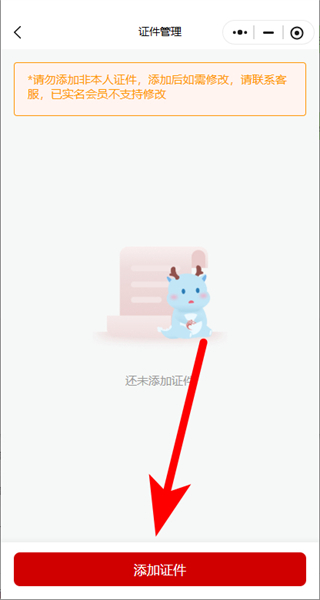 3、在证件管理页面,点击添加证件按钮,进入实名认证页面。