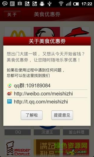 美食优惠券app是一款购物,提供本地的餐饮、休闲、娱乐服务,汇集各种美食店的美食优惠劵,支持qq,MSN,新浪微博,腾讯微博,人人网,开心网等应用分享。手拿优惠劵,吃喝玩乐甩起来!快来下载体验吧!