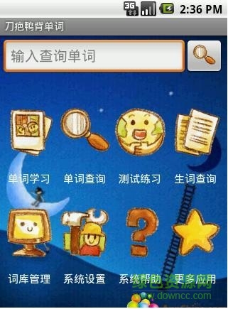 单词学习、单词查询、生词记录、测试练习等功能。无需上网,让你随时随地轻松背单词!本软件预装了从小学、中学、大学四六级、考研到托福、雅思共27个词库,还可自由下载词库安装,满足你的个性化需求。真人发音、三种单词测试练习模式、成长升级系统,让你在刀疤鸭的帮助下,爱上背单词!