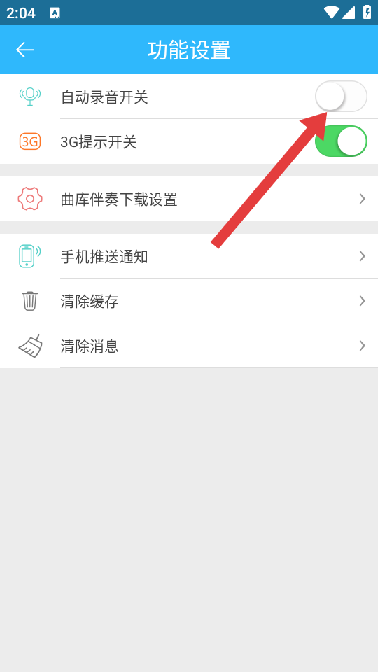 4、在功能设置页面,找到自动录音开关选项,点击开启自动录音功能。