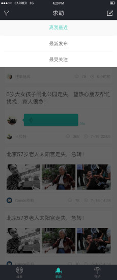 同时当发生儿童、老人或宠物走失时,也可以发布寻找信息,通过与周围人联动的方式,帮助你一起寻找。