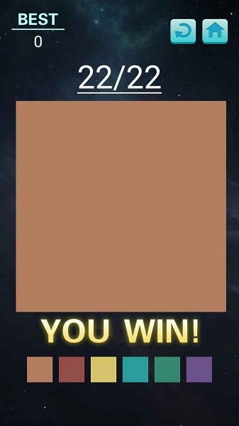 消灭色彩游戏中,在22步内,根据方框内提供的颜色,点击下面的颜色使临近同一个颜色成片,消灭其他颜色,最后方框内只剩一个颜色算胜利,如果22步以后还是多个颜色算失败。