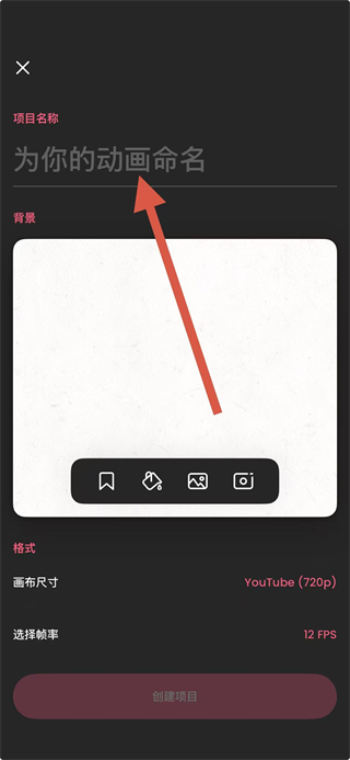 2、进入创建项目页面,在项目名称处为你的动画命名,确定名称内容。