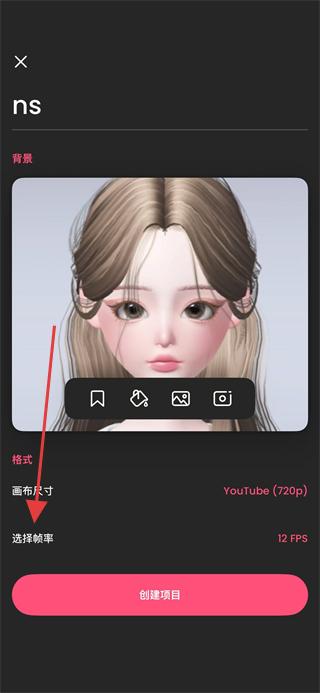 3、在创建项目页面设置背景等相关内容后,点击选择帧率选项,设置帧率参数。
