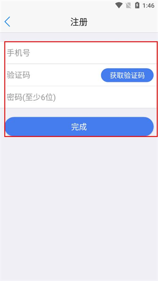 3、在注册页面填写手机号,获取并输入验证码,设置密码后点击完成按钮,完成账号注册。
