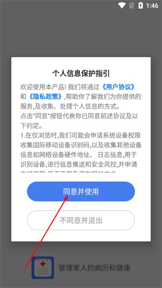 1、打开小明病历本app,在个人信息保护指引页面点击同意并使用。