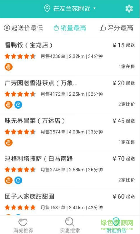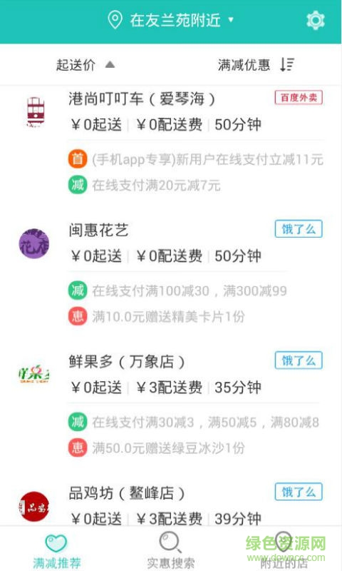 3、新增“满减推荐”功能,可按起送价高低或满减优惠力度大小来筛选外卖商家,哪家起送更便宜,哪家优惠力度更大,一目了然!
