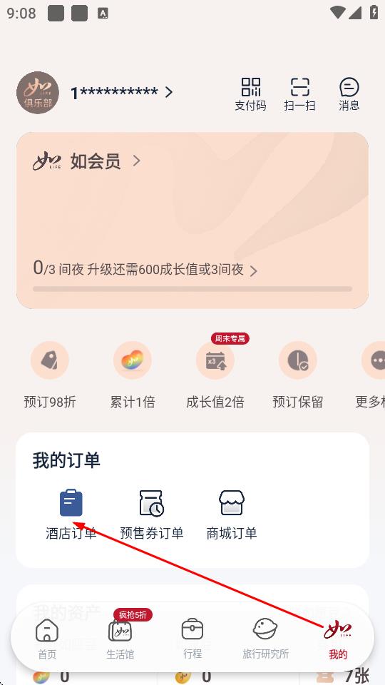 3、进入酒店订单页面后,可以看到不同状态的订单分类,如全部、待支付、待入住等,点击相应分类查看对应状态的订单。