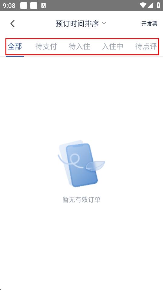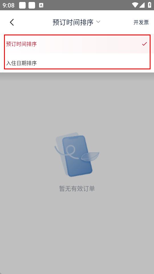 4、若需要对订单进行排序查看,可以点击页面上方的预订时间排序,选择预订时间排序或入住日期排序来调整订单显示顺序。