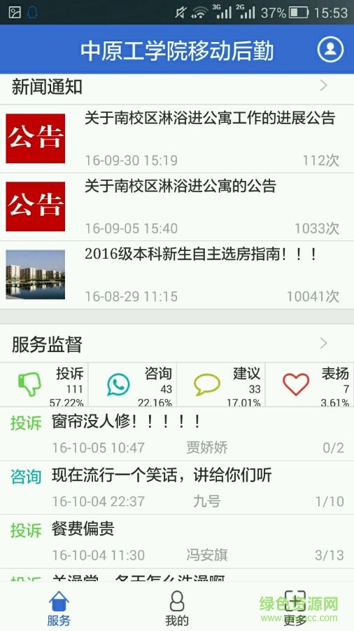 中原工学院移动后勤客户端是集中原工学院后勤系统服务为一体的校园生活应用,也是一站式移动校园应用服务平台。通过该App可以随时随地了解学校概况、校园新闻、通知公告、社团活动等资讯,进行报修、监督服务等服务内容,还可实现数据统计查询、挖掘、分析等多种功能。旨在为师生提供覆盖校园服务全生命周期的、师生真正感兴趣的、具有较高使用价值的、方便快捷的移动服务。需要的用户快来绿色资源网下载吧。