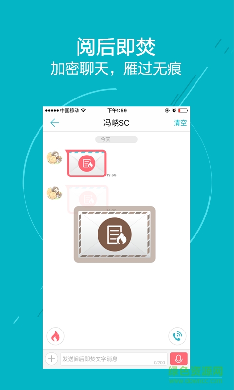 3、阅后即焚消息一键焚毁,在对方打开图片、文字或听到语音留言几秒后,消息即在双方手机内消失,对方无法查看之前的消息记录,服务器上也不留痕,每一条信息都有你独特的味道。