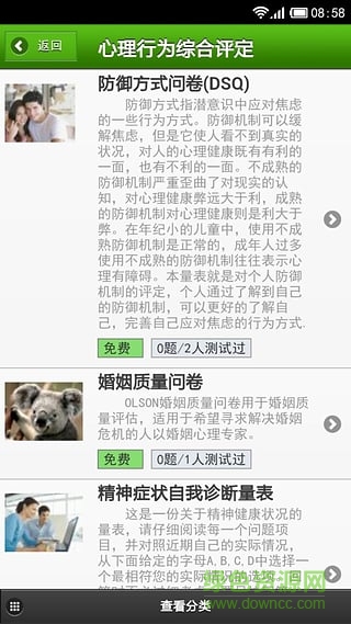 3、这里的量表涵盖目前国内外专业心理测验,内容涉及人才测评、智力测验、情商测验、性格气质测验、爱情婚姻测验、心理健康测验、儿童心理测评等各个方面,可从不同角度满足您对当前心理现状的把握,及时了解自身心理发展健康状况。
