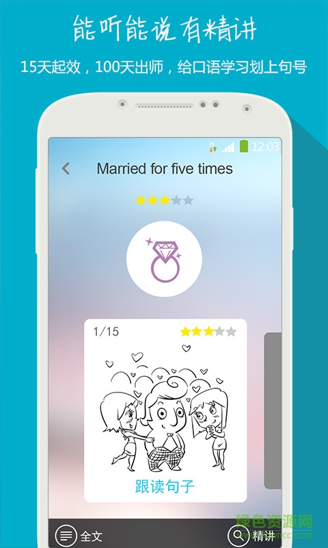 国际成熟的语音评测系统,纠正并固化发音,跟读模仿、录音再现、评分、要点精讲,使得听力和口语很短时间就有质的提高。