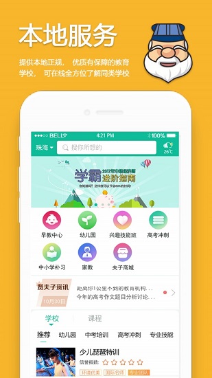 学校类型全面:包含早教,幼儿园,中小学补习,高考冲刺,兴趣技能培训(音乐,舞蹈,武术,体育,棋艺,智力开发等),上门家教等本地服务。